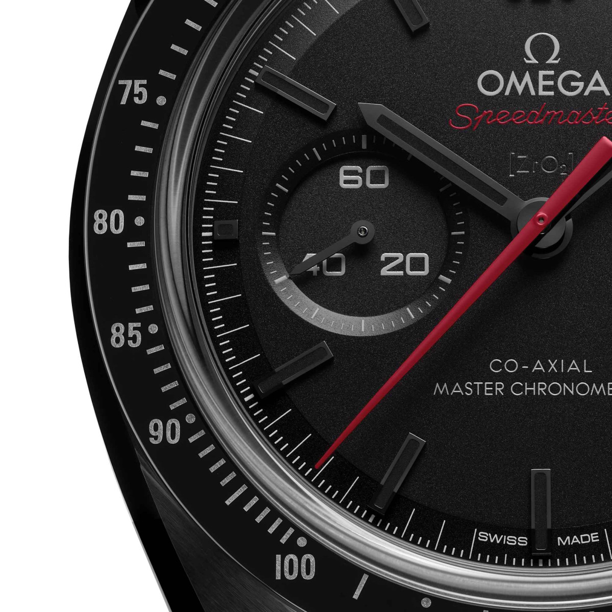 Das durch den Gehäuseboden sichtbare OMEGA Co-Axial Master Chronometer Kaliber 9908 mit Handaufzug ist mit einer speziellen „Black Edition“-Veredelung versehen, die eine mattgeschwärzte Hauptplatine und Brücken sowie schwarz lackierte Gravuren umfasst. Die Uhr wird an einem schwarzen Kautschukarmband mit einem Mondoberflächenmuster auf der Unterseite, einer Faltschließe aus Keramik und keramisiertem Titan getragen.