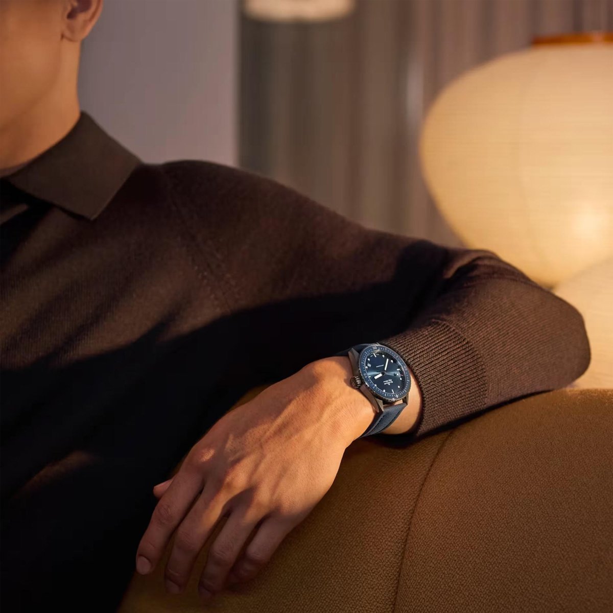 Lünette einseitig drehbar, aus satinierter blauer Keramik mit Keramikeinlage und Indizes aus Liquidmetal™