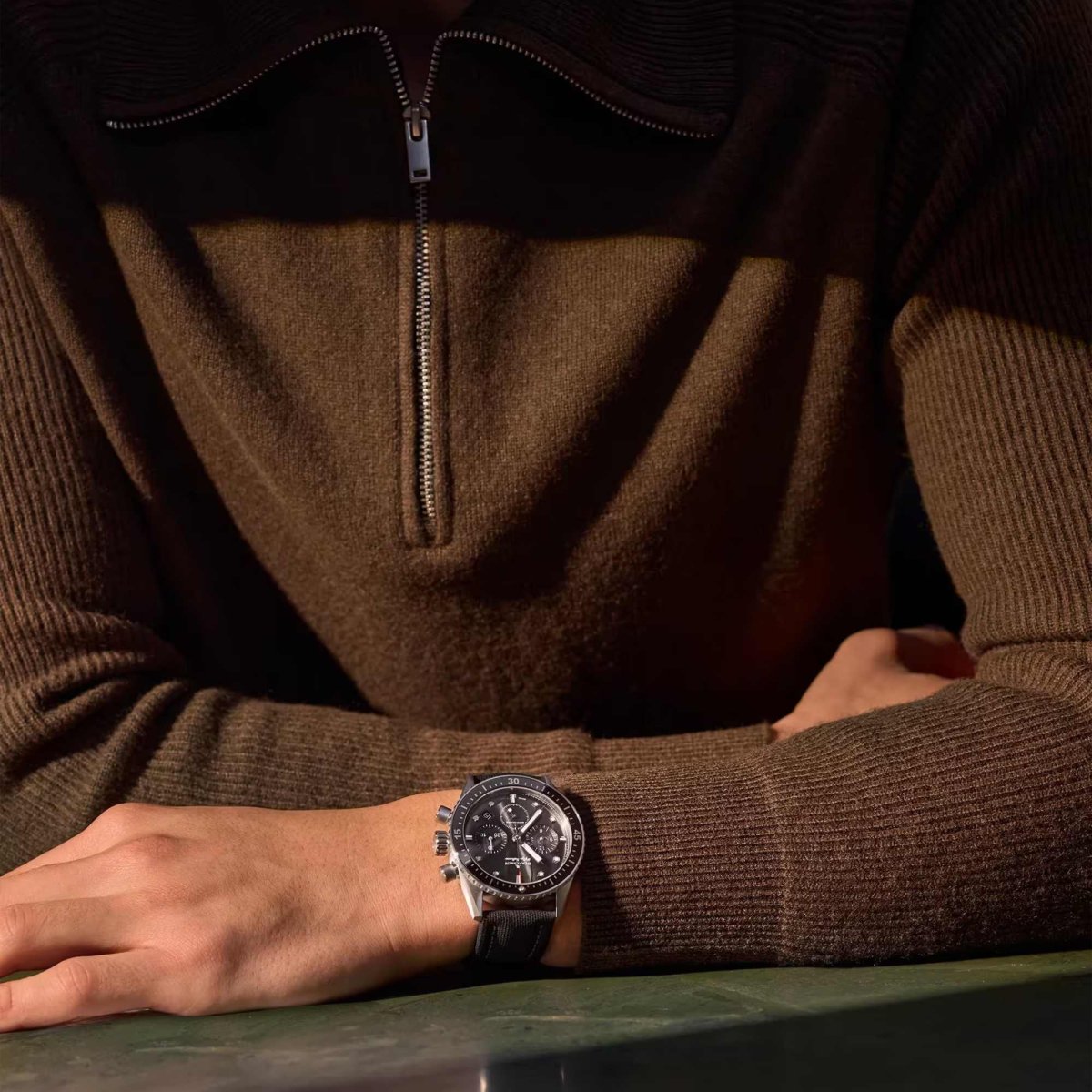 Stunde, Minute, Sekunde, 30 Minuten-Zähler bei 3 Uhr, Datum zwischen 4 und 5 Uhr, 12 Stunden-Zähler bei 9 Uhr, Flyback-Funktion