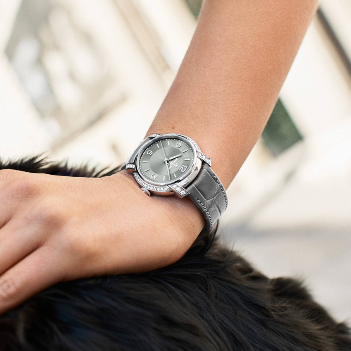 Minimalistische Ziffern, Rautenzeiger und eine skulpturale Krone vervollständigen die Uhren, die sich wie ein Schmuckstück aussehen. Die 36-mm-Automatikmodelle verbinden edle Zifferblätter mit farblich abgestuften Armbändern aus Alligatorleder. Im Inneren arbeitet das COSC-zertifizierte Automatikwerk Kaliber 10. Die Lady Premier ist das Uhrenmodell für Frauen mit Leichtigkeit, Selbstvertrauen und einer Portion Lebensfreude.
