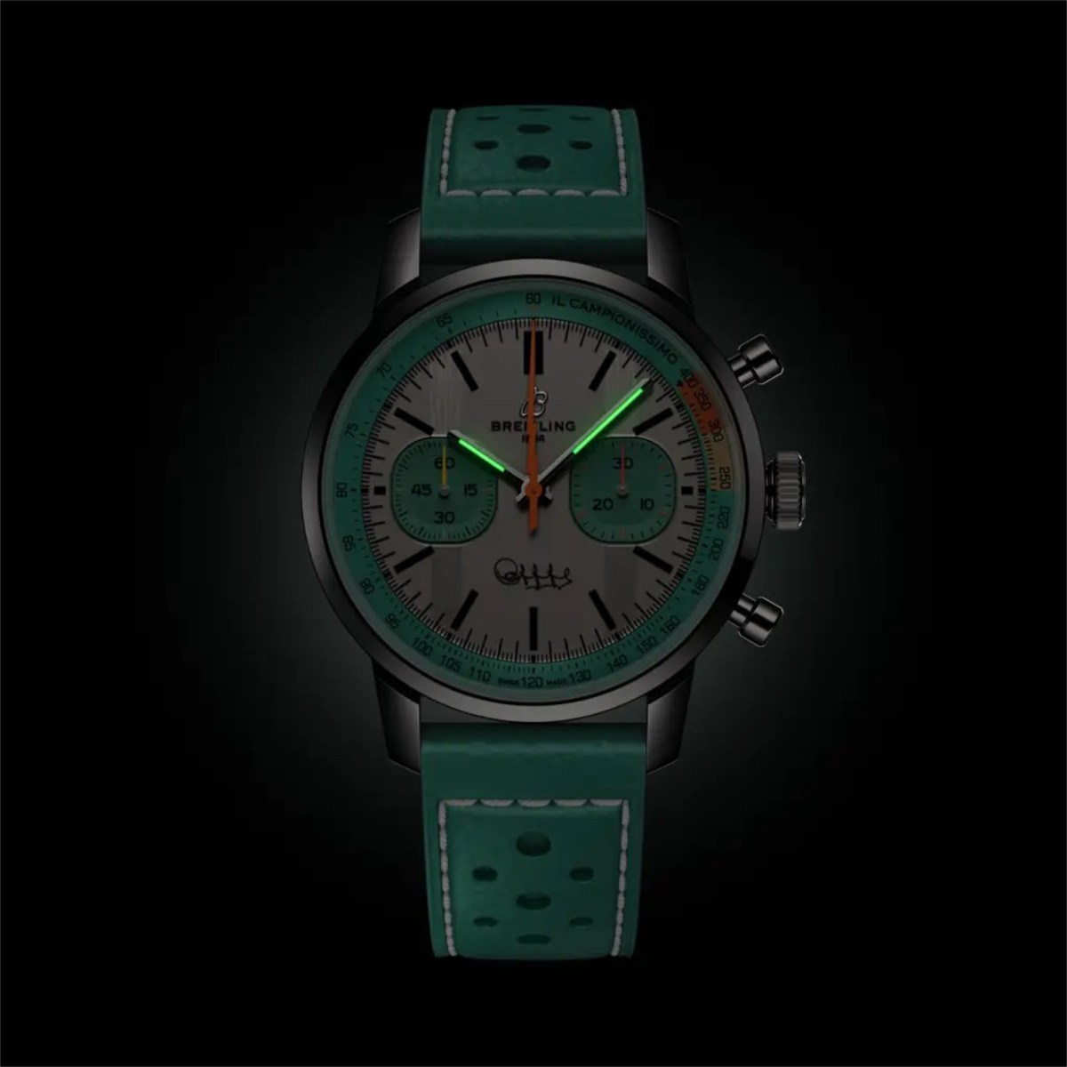 Ref. AB01768A1A1X1 - Die in den 1960er Jahren eingeführte, unkonventionelle, vom Rennsport inspirierte Chronographenlinie von Willy Breitling fing die freizügige Atmosphäre dieser Ära ein. Heute verkörpert die neue Top Time-Kollektion diese adrenalingeladene Energie und verbindet modernes Retro-Design mit innovativer Leistung. Fausto Coppi und Gino Bartali waren nicht nur Weltmeister, sondern Symbole des Sportsgeistes. Beide waren Botschafter von Breitling zu einer Zeit, als die Marke offizieller Zeitnehmer der größten Rennen des Radsports war und ihre Liebe zum Sport ein Millionenpublikum inspirierte. Der Chronograph trägt Coppis Spitznamen auf der Tachymeterskala: «Il Campionissimo» (Meister der Meister) und seine Signatur bei sechs Uhr macht die Verbindung noch persönlicher.