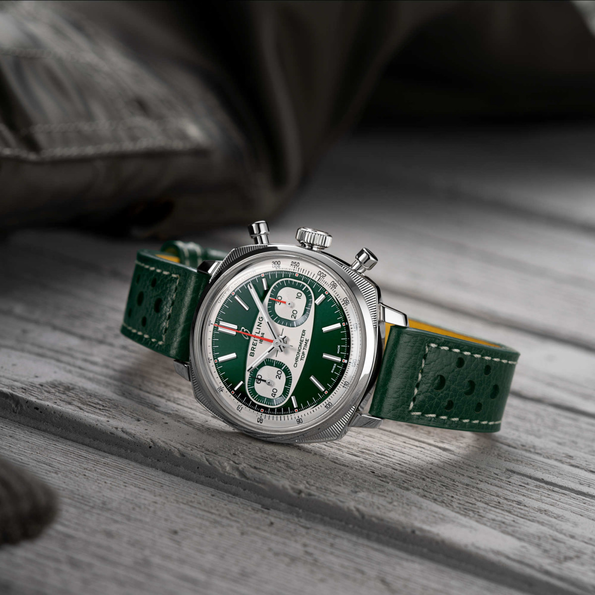 Das kissenförmige Gehäuse, die markante Tachymeterskala und die unverkennbaren Hilfszifferblätter in der Form von Superkreisen erinnern an die hohen Geschwindigkeiten und die sekundenschnellen Entscheidungen auf der Rennstrecke. Das Herzstück des Zifferblatts ist das charakteristische «Surfboard»-Motiv – ein elliptisches Design, das direkt aus den Top Time-Archiven stammt und von den Armaturenbrettern der Oldtimer inspiriert ist.