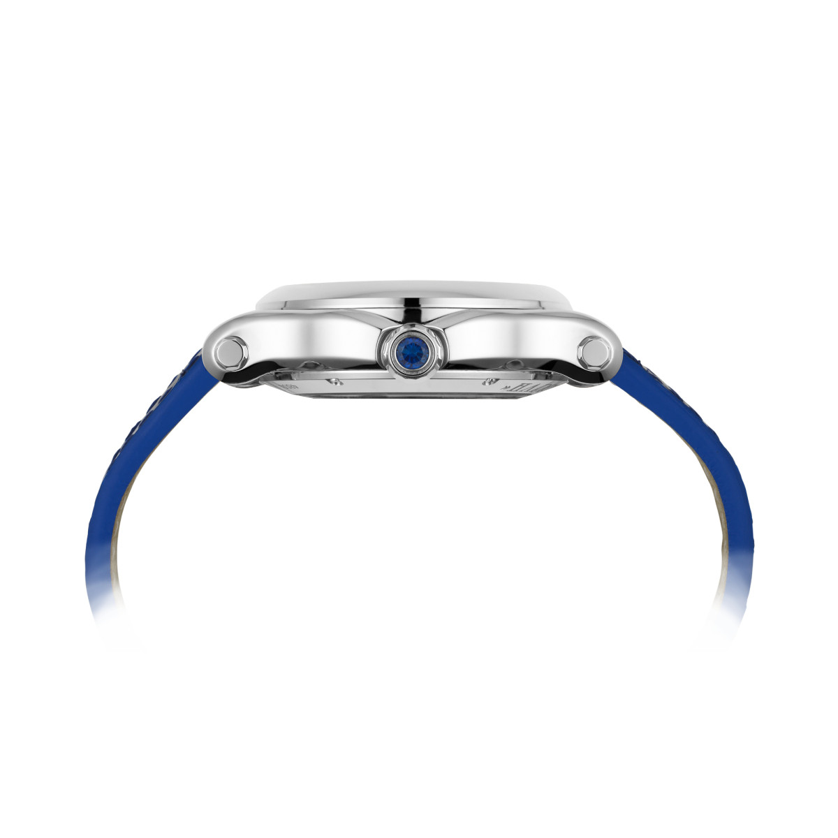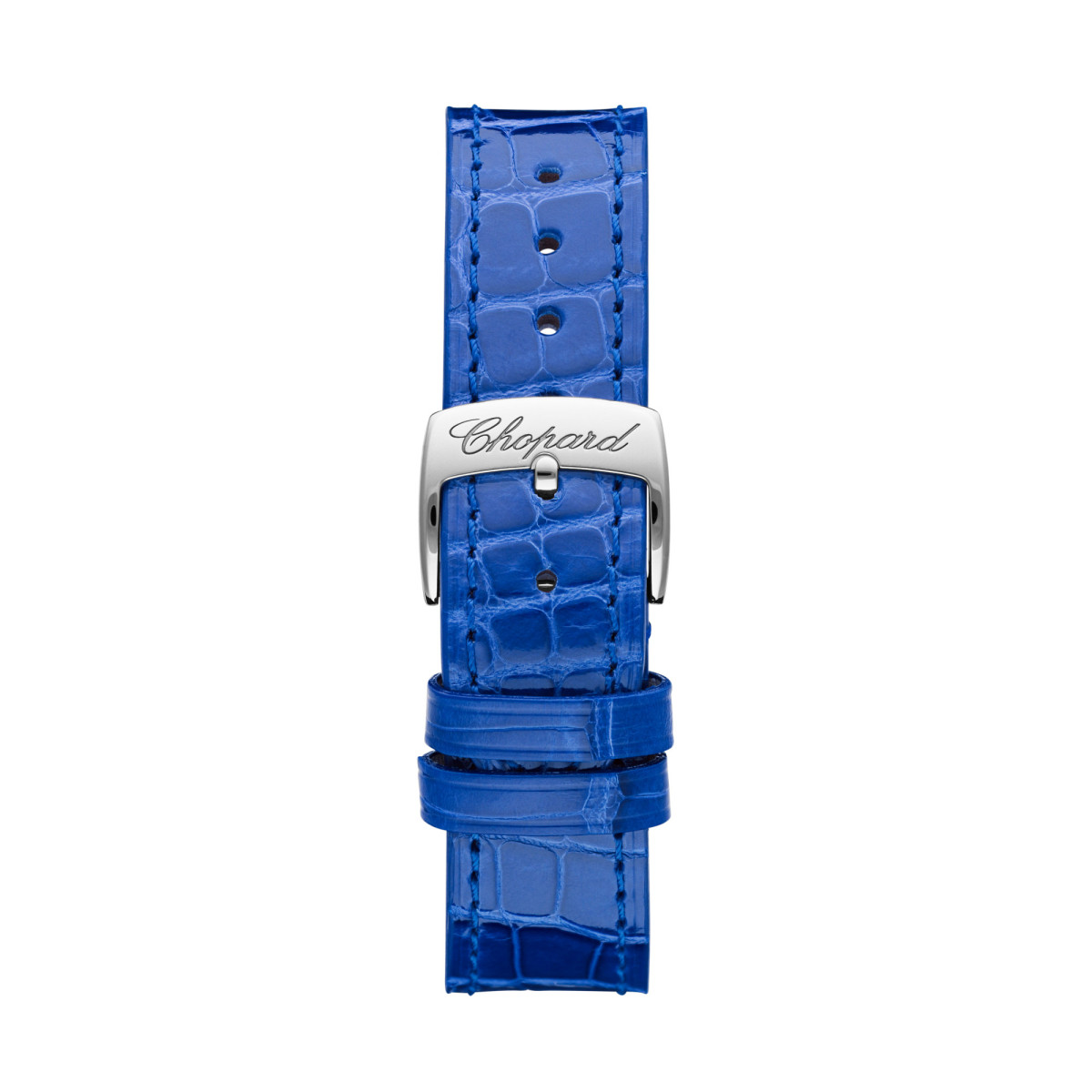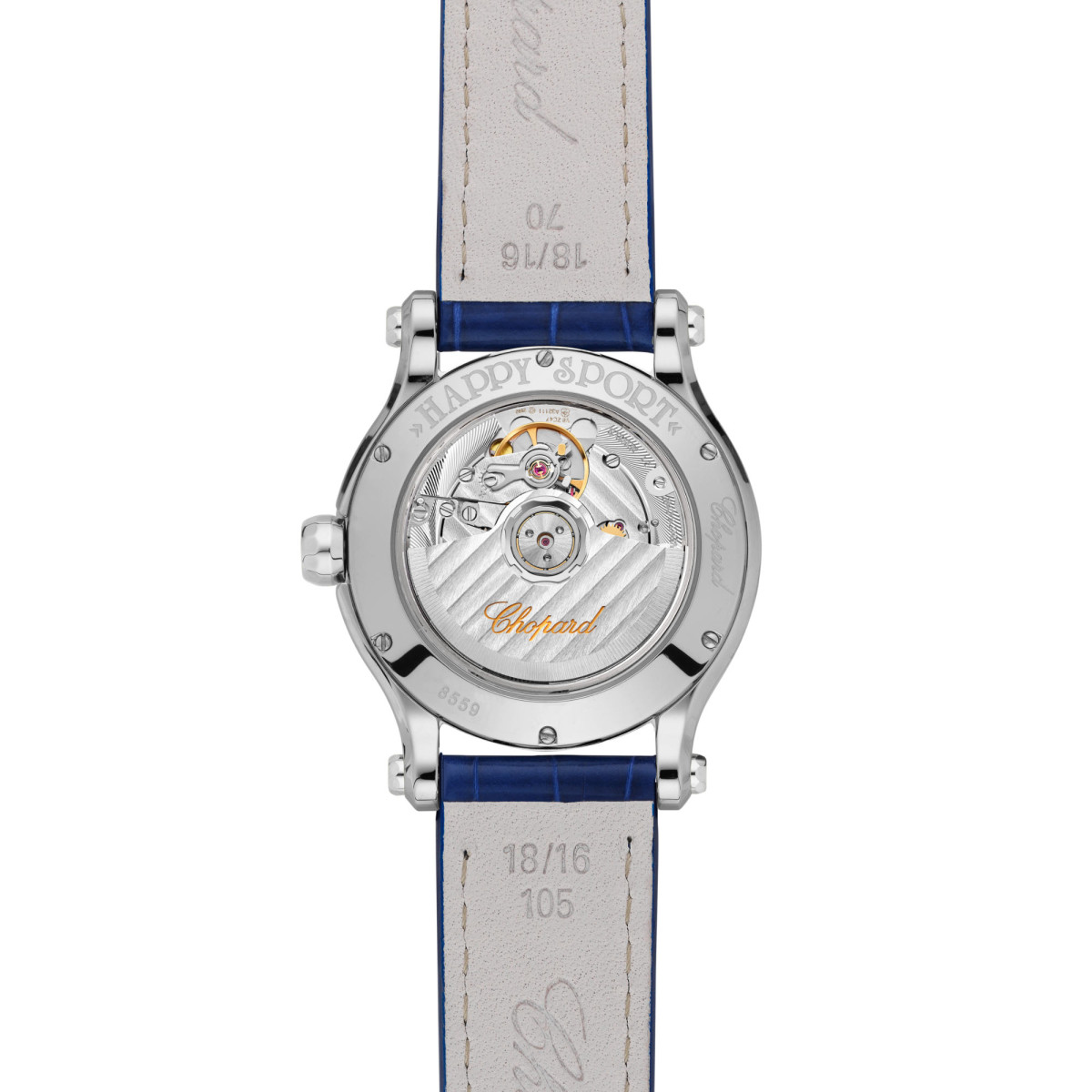 Ref. 278559-3011 - Die Edelstahluhr Happy Stars ist eine Hommage an das schlagende Herz von Venedig: der Uhrturm auf dem Markusplatz. Der Zeitmesser zeigt einen sich im Wasser spiegelnden Sternenhimmel und tanzende Himmelskörper mit drei diamantbesetzten Sternen aus 18 Karat Weissgold und einem Mond sowie einer strahlenden Sonne aus 18 Karat Roségold, die unter dem Saphirglas auf einem blau guillochierten Zifferblatt tanzen.