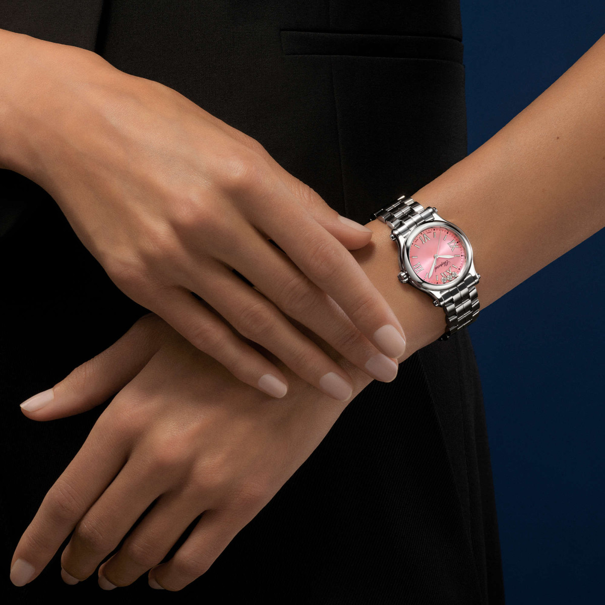 Ref. 278590-3012 - Die Happy Sport-Kollektion ist das Sinnbild für die Kreativität und Stärke von Chopard. Ihre verspielten, frei wirbelnden Diamanten tanzen zwischen zwei Saphirgläsern und fangen seit 1993 die Vorstellungskraft ein, als Chopard das das erste Unternehmen war, das Edelstahl und Diamanten kombinierte. Little Diamonds Do Great Things