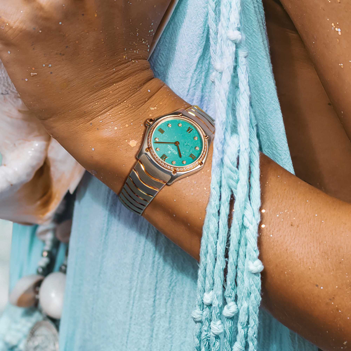 Ref. 1216599 - EBEL Sport Classic Damenuhr, Gehäuse aus Edelstahl und 18K Gelbgold mit 47 Diamanten (0.3055ct.), Ø 29 mm, Türkis-Zifferblatt mit applizierten römischen Ziffern und 8 Diamanten (0.052ct.), innenseitig entspiegeltes Saphirglas, Wellengliederarmband aus Bicolor-Edelstahl mit Faltschließe, Schweizer Quarzwerk, Limitierte Auflage: 200 Stück, wasserdicht bis 5 bar.