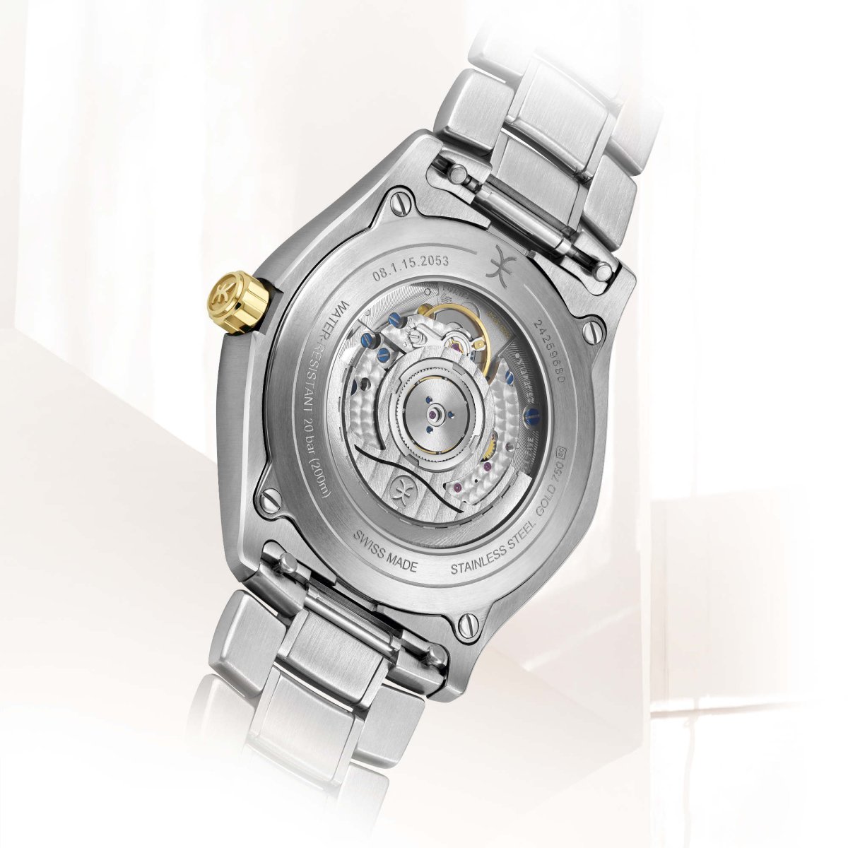 Ref. 1216677 - EBEL 1911 Herrenuhr, Gehäuse aus Edelstahl, Krone und Lünettenschrauben aus 18K Gelbgold, Drehlünette mit schwarzem Keramikring, Ø 42 mm, schwarz galvanisiertes Zifferblatt mit arabischen Ziffern und applizierten Super-LumiNova® Indizes, Datumsfenster auf 6:00 Uhr, innenseitig entspiegeltes Saphirglas, Gehäuserückseite aus Saphirglas, Gliederarmband aus Bicolor-Edelstahl, Faltschließe, zusätzliches braunes Kalbslederband, Schweizer Automatikwerk, wasserdicht bis 20 bar.