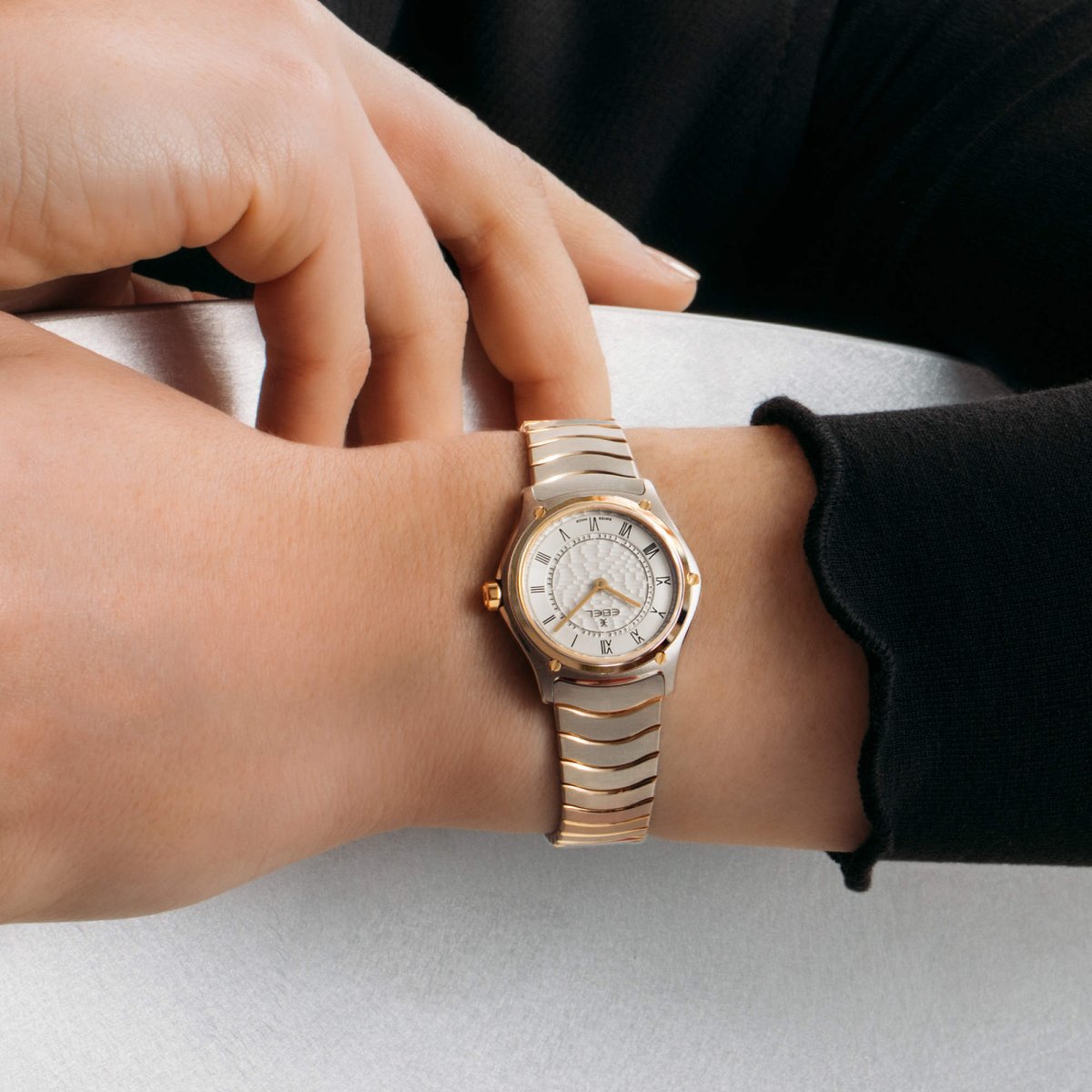 Ref. 1216697 - EBEL Sport Classic Damenuhr, Gehäuse aus Edelstahl und 18 Karat Gelbgold, Ø 29 mm, weißsilbernes Zifferblatt mit eingravierten und schwarz lackierten römischen Ziffern, Wellenmuster, Saphirglas mit Antireflexbeschichtung auf der Unterseite, zweifarbiges Wellengliederarmband aus Edelstahl mit Faltschließe, Schweizer Quarzwerk, wasserdicht bis 5 bar