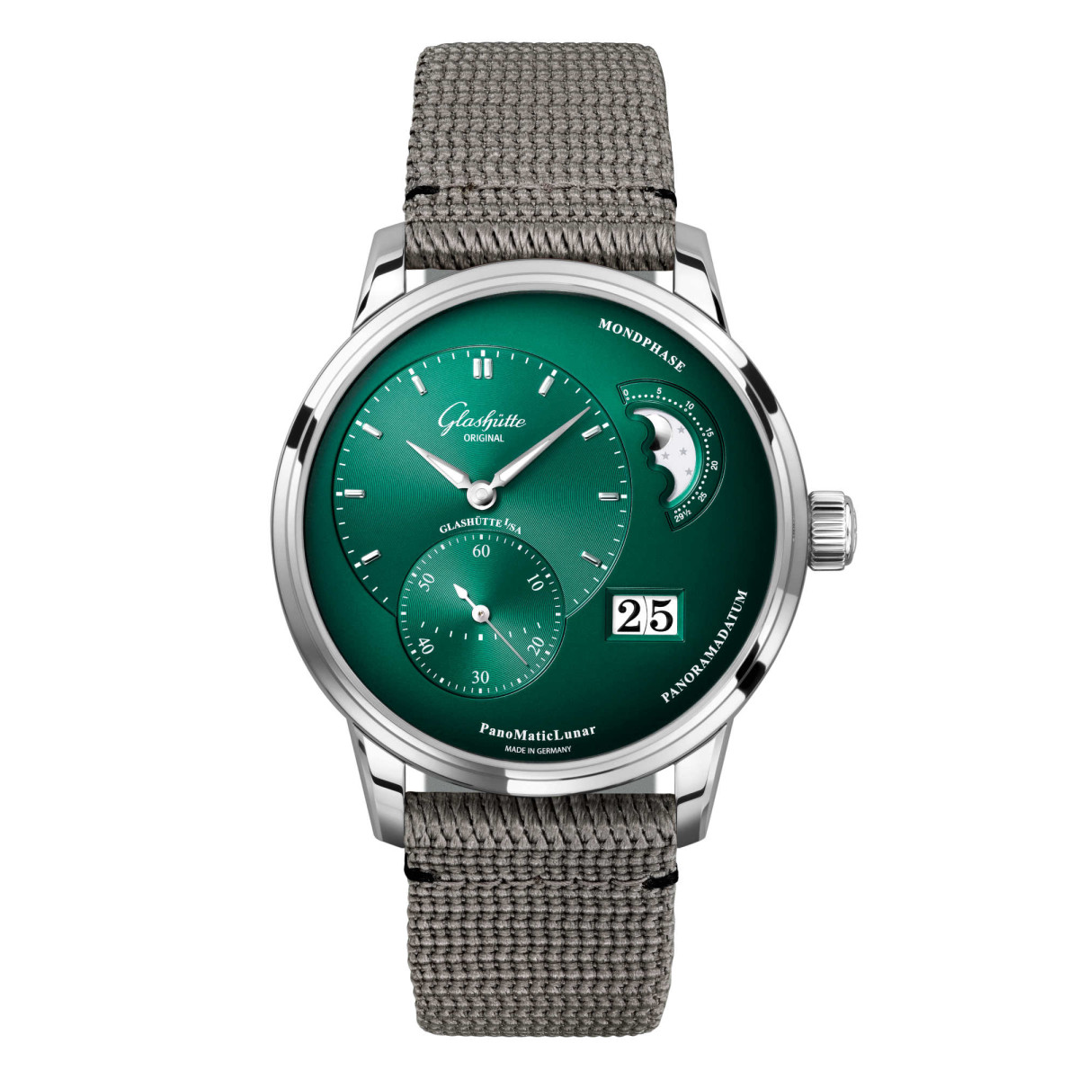 Ref. 1-90-02-13-32-66 - Das Erkennungsmerkmal der Pano Kollektion ist die asymmetrische Zifferblattaufteilung. Die Achsen sämtlicher Zeiger liegen dabei auf einer Linie in der linken Zifferblatthälfte, während die rechte Seite vom Panoramadatum und der prächtigen Mondphasenanzeige geprägt ist. - Der Faszination des Mondes kann sich niemand entziehen – Glashütte Original fängt seine Schönheit kunstvoll ein. Filigrane Zifferblätter bieten den idealen Rahmen für die Anzeige der Mondphase: das faszinierende Schauspiel eines zu- und abnehmenden Mondes auf seinem Umlauf von 29,53 Tagen.