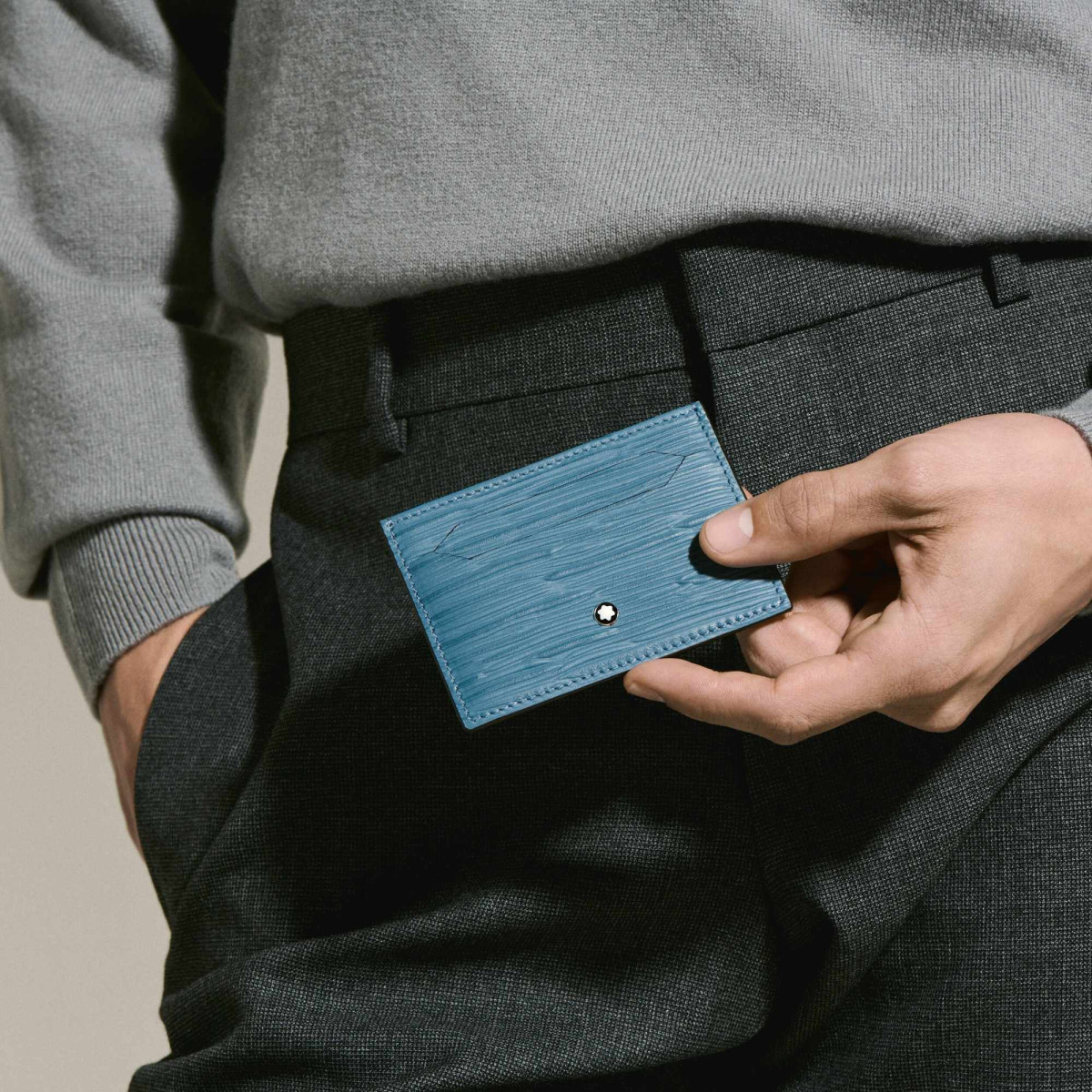 Ref. MB199349 - Dieses kleine und stilvolle Kartenetui 4810 in Rauchblau ist aus hochwertigem bedrucktem Leder mit Baumrindenmotiv gefertigt. Die kompakte Silhouette bietet Platz für bis zu fünf Kreditkarten und ist ein vielseitiger alltäglicher Begleiter.