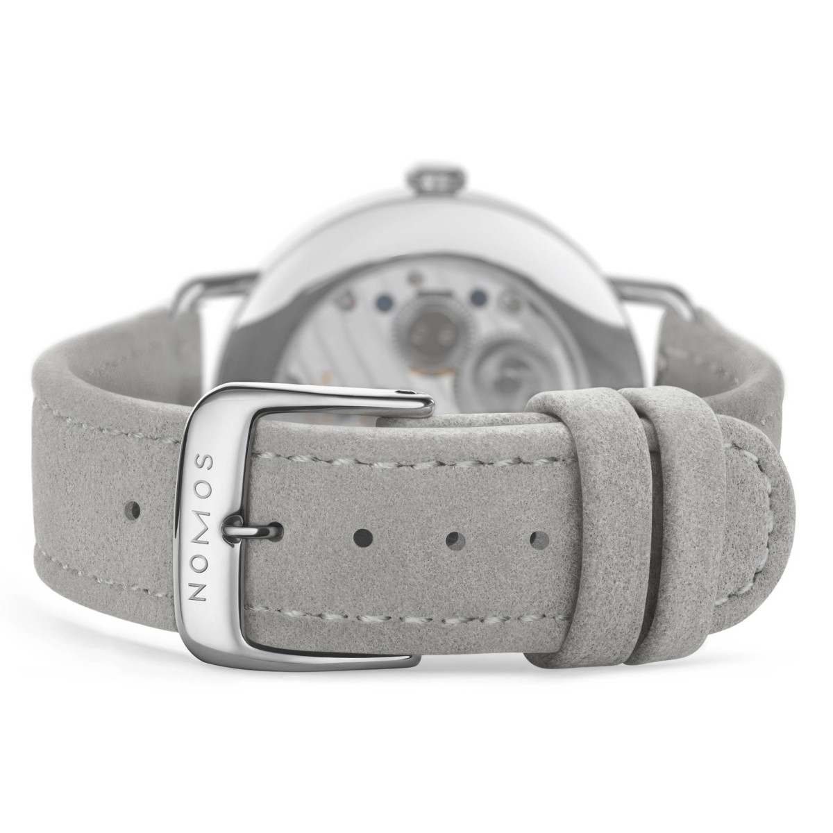 Ref. 1122 - All Silver wie die Fronten von Bürotürmen in den Schluchten der Großstadt – alles Glas, Edelstahl und nein: kein Beton, dafür ein hochwertiges Band aus veganem Velours in Samtgrau. Der Minutentakt spielt die Hauptrolle im Design von Metro, die langen, geraden Zeiger sind wie das Empire State Building gestuft. Mit Handaufzugskaliber Alpha aus Glashütter Manufaktur und in der smarten Größe von nur 33 Millimeter Durchmesser.