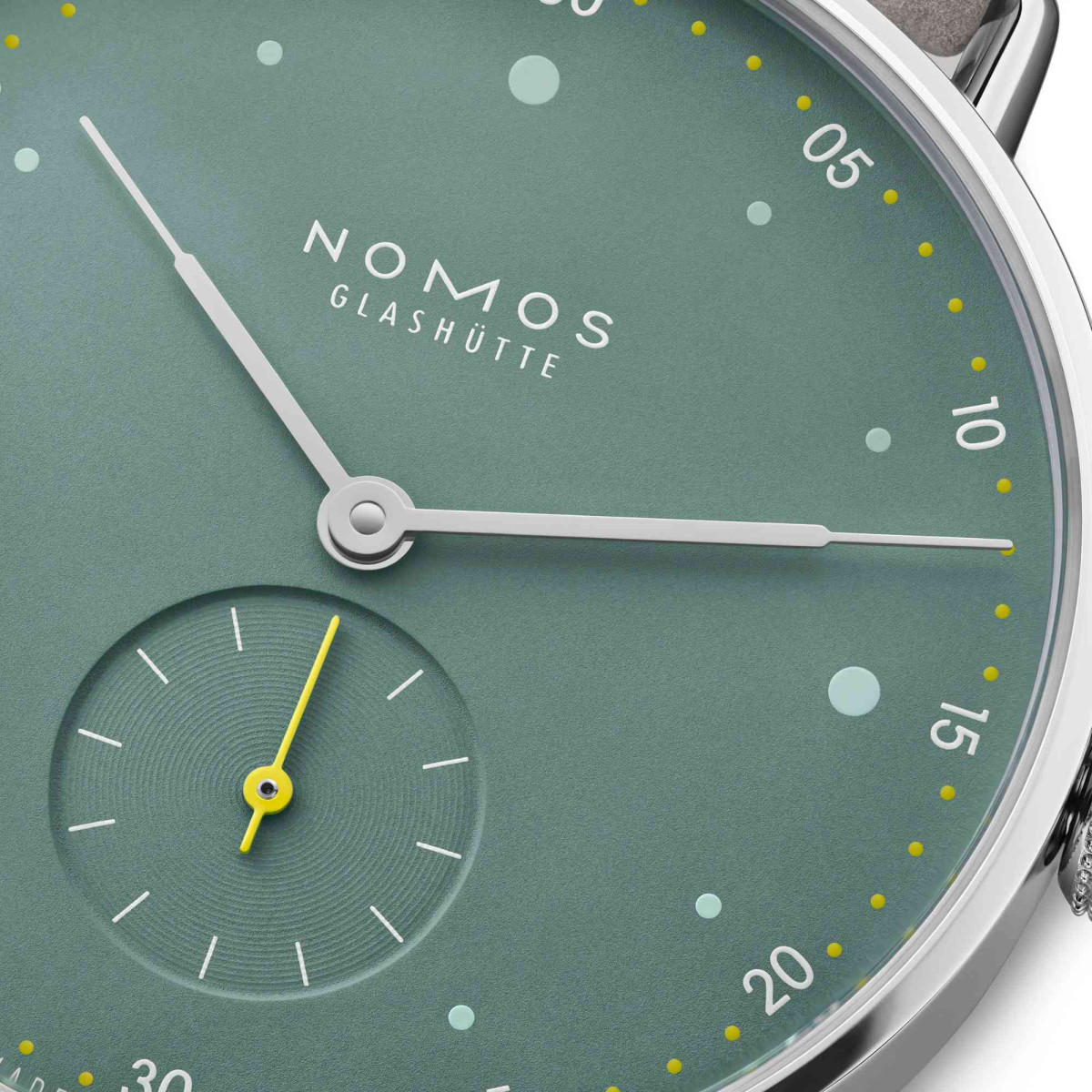 Ref. 1124 - Der Salbeiton des Zifferblatts dieser Handaufzugsuhr im Design von Mark Braun erinnert an die offene See ebenso wie an die Patina von Kupferdächern. Großstadt mit einer Brise Meeresluft, tragbar gemacht in einem Edelstahlgehäuse mit geschmeidigen Bügelanstößen und gewölbten Saphirglas. Metro 33 sage ist wasserdicht bis 5 atm und wird vom NOMOS-Manufakturkaliber Alpha angetrieben. Mechanische Zeitmessung für das Leben in der Metropole.