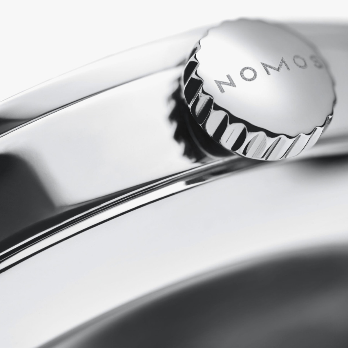 Feinregulierung in sechs Lagen, Schrauben temperaturgebläut, Werkoberflächen rhodiniert mit Glashütter Streifenschliff und NOMOS-Perlage