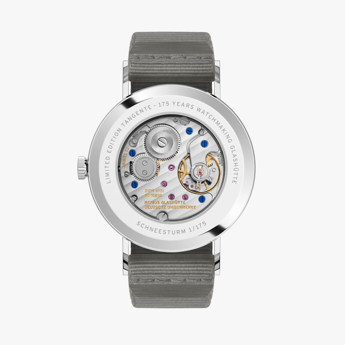 Ref.179.S24 - Die Ikone in Farbe. Voller Kraft und Komplexität. Für die Sonderedition der Handaufzugsuhr Tangente 38 mit Datumsfunktion wurden zahlreiche Elemente des Zifferblatts individuell auf den Charakter der Uhr abgestimmt. 31 besondere Modelle für jeden Tag des Monats sind daraus entstanden, 31 Persönlichkeiten – auf je 175 Exemplare limitiert. Tangente Datum Schneesturm entfaltet ihre kraftvolle Wirkung durch das kühne und nur von etwas Schwarz umwirbelte Weiß. Ähnlich wie beim Modell Super Sardine ist hier eine Uhr mit Vintage-Charakter entstanden, die das Layout des Ursprungsmodells gerade durch die farbliche Variation stützt und stärkt.