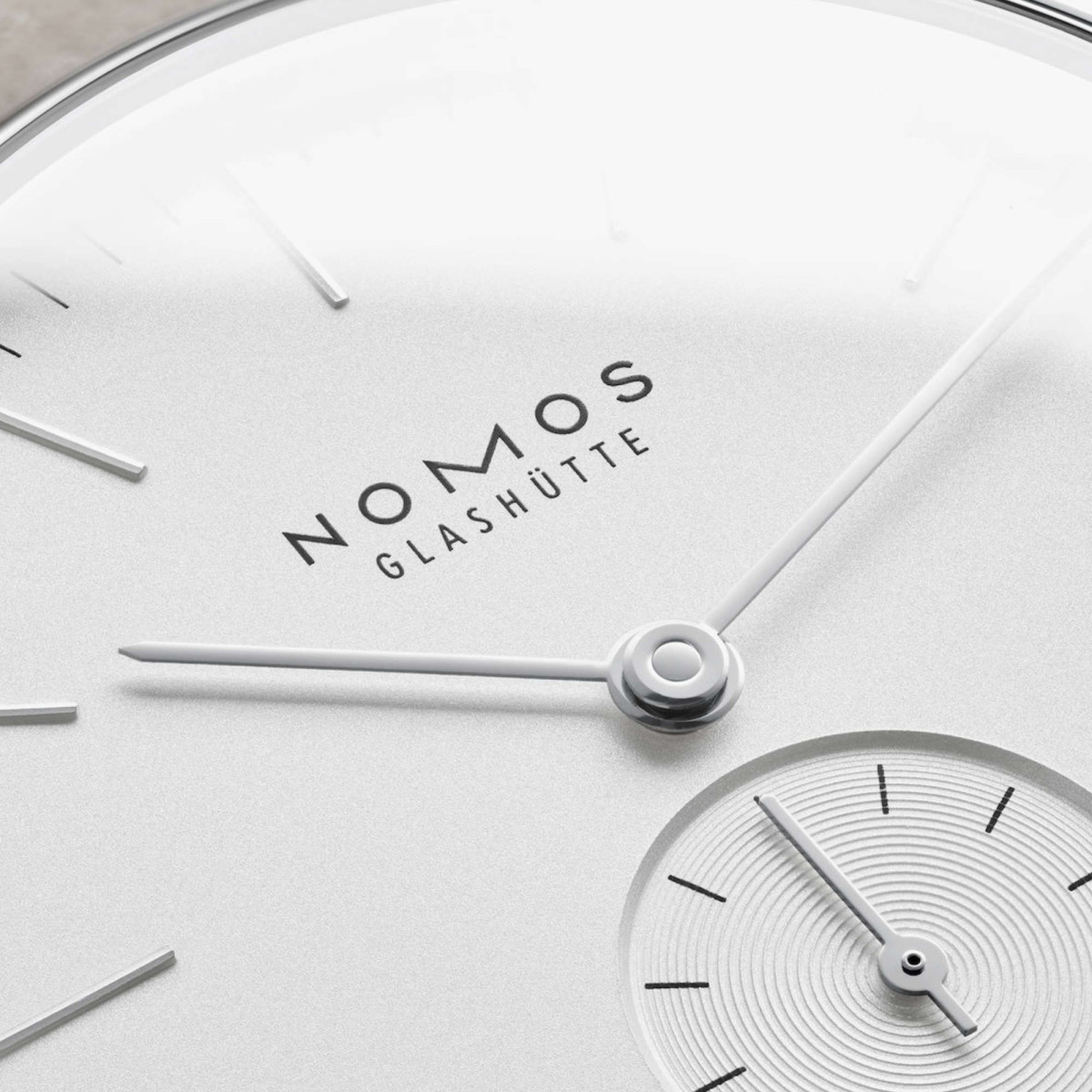 Ref. 324 - Orion in kleiner, mit 33 Millimetern Durchmesser und filigranen weißen Indizes auf weiß versilbertem Zifferblatt. Eine elegante, zeitlose Uhr für jeden Tag im Leben. Der Saphirglasboden gestattet einen Blick auf NOMOS-Handaufzugskaliber Alpha, das erste unserer zehn eigenen Werke. Getragen wird dieses Modell am zarten, hellen Velourslederband.