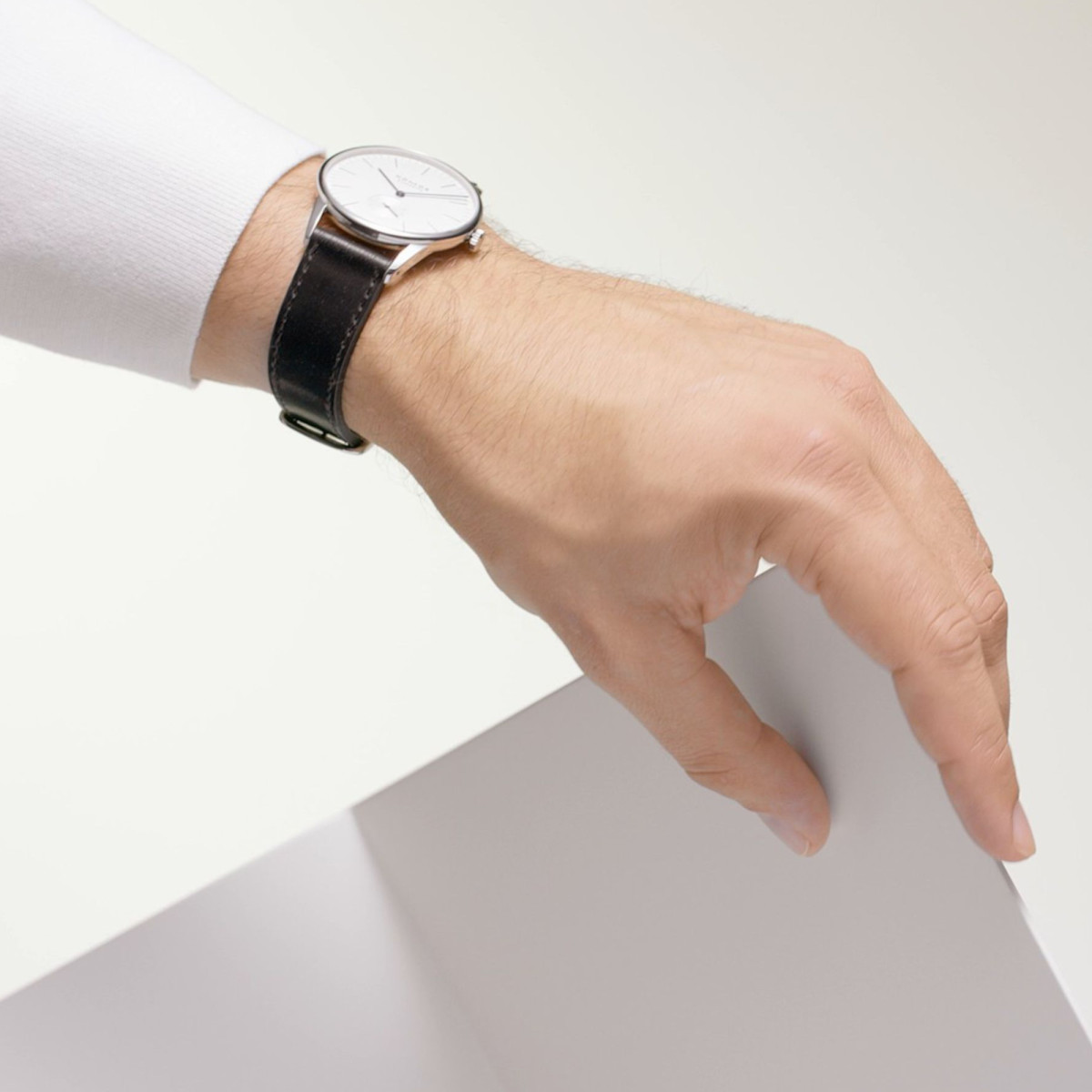 Lagen; temperaturgebläute Schrauben; rhodinierte Werkoberflächen mit Glashütter Streifenschliff und NOMOSPerlage; Sperr- und Kronrad mit Glashütter Sonnenschliff