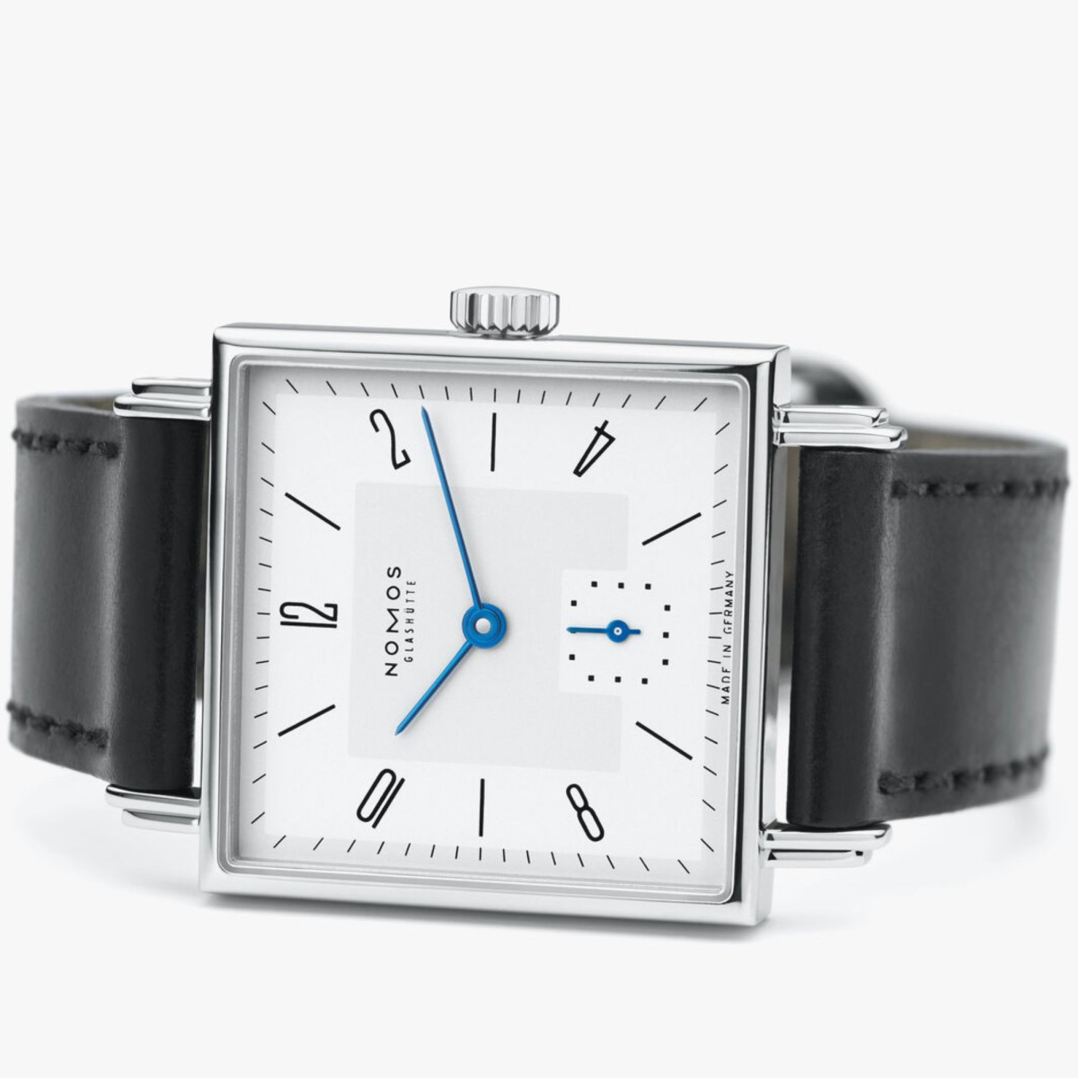 Ref. 401 - Manchen Handgelenken stehen eckige Uhren einfach besser: Deshalb gibt es Tetra 27, eine der kleinsten bei NOMOS Glashütte. Jede ihrer Seiten misst 27,5 Millimeter – macht pi mal Daumen: Liebe im Quadrat. Ein vielfach preisgekrönter Handaufzugsklassiker mit weiß und grau versilbertem Zifferblatt und temperaturgebläuten Zeigern, ein Quadrat fürs Leben.
