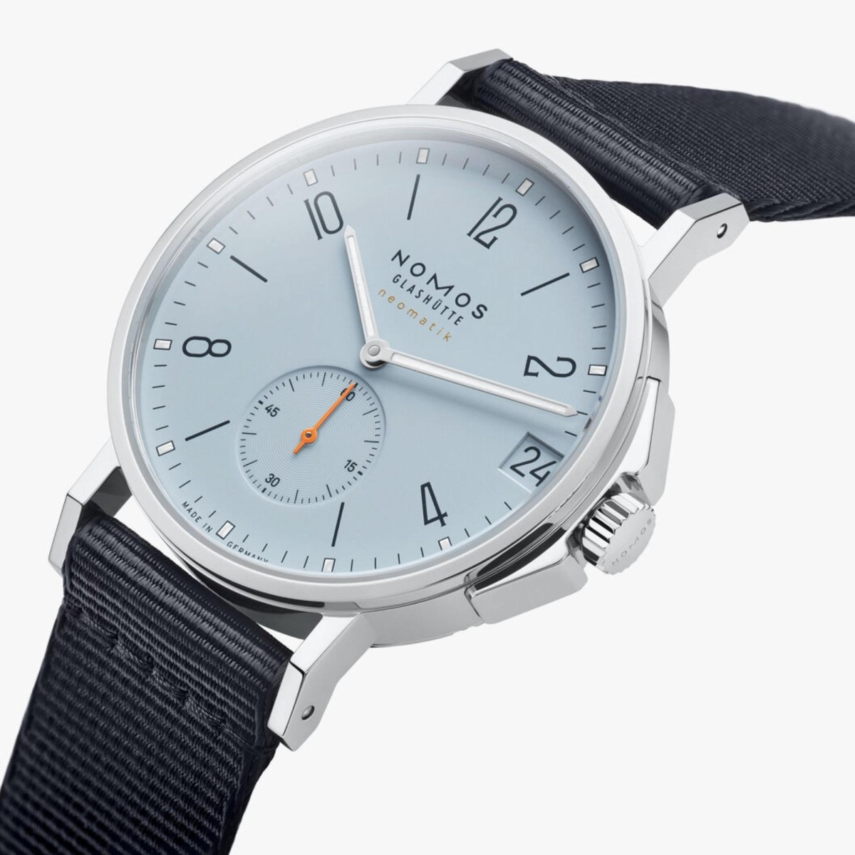 Himmelblaues Zifferblatt mit arabischen Ziffern und Indizes