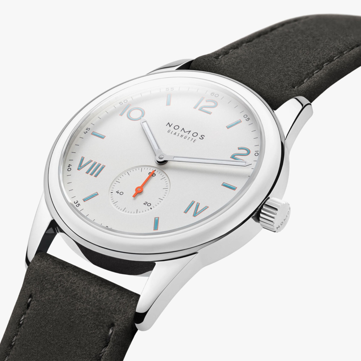 Zeiger: Stunden- und Minutenzeiger rhodiniert und mit Superluminova ausgelegt (blau nachleuchtend); Sekundenzeiger neon-orange