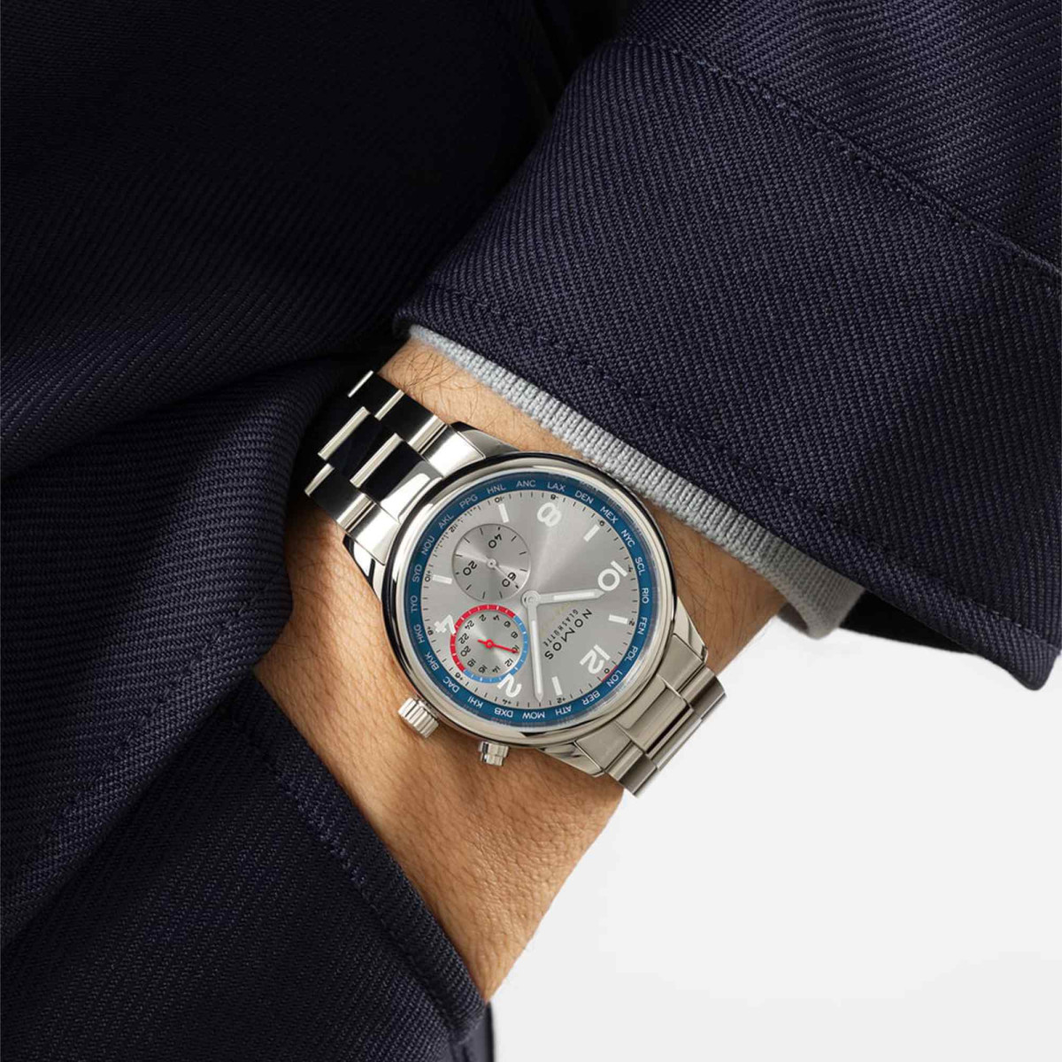 Ref. 791 - Weltzeit neu gedacht: robust, strahlend, übersichtlich und elegant. Das superflache neomatik-Kaliber DUW 3202 ermöglicht eine Gehäusehöhe von unter 10 Millimetern – damit ist Club Sport neomatik einer der weltweit schlanksten Worldtimer. Die Zeitunterschiede zwischen der ausgewählten Region und den anderen Zeitzonen lassen sich auf einen Blick erfassen, mit dem Drücker auf 2 Uhr ist der Mechanismus komfortabel zu bedienen, das rhodinierte Zifferblatt mit Strahlenschliff repräsentiert Sportlichkeit pur.