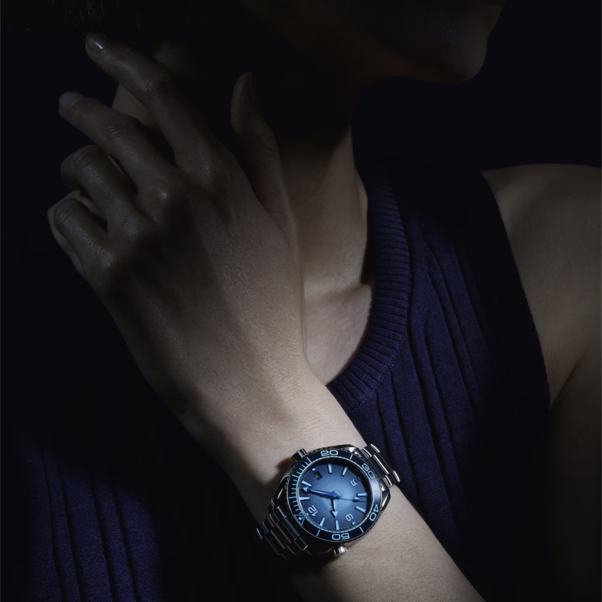 Das vertikal gebürstete Zifferblatt aus Keramik in OMEGAs eigenem Summer Blue verfügt über eine PVD-Beschichtung und einen lackierten Farbverlauf, der die Wasserdichtigkeit der Uhr symbolisiert. Eine blaue Keramiklünette mit einer hellblauen Tauchskala umgibt die kühne Anzeige, zu der gebläute Zeiger und Indizes gehören, die mit einer einzigartigen hellblauen Super-LumiNova gefüllt sind.