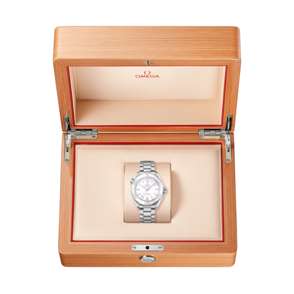 Dieses Modell mit kratzresistentem Saphirglas verfügt über ein weißes Keramikzifferblatt mit arabischen Ziffern und ein Datumsfenster bei 3 Uhr. Die einseitig drehbare weiße Keramiklünette mit Tauchskala aus OMEGA Liquidmetal® ist auf einem 39,5-mm-Gehäuse aus Edelstahl angebracht.