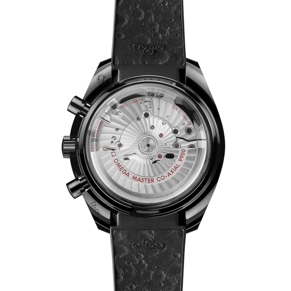 Dieser markante Zeitmesser wird von OMEGAs Co-Axial Master Chronometer Kaliber 9900 mit Automatikaufzug angetrieben und ist mit einem schwarzen Kautschukarmband mit Mondoberflächenmuster auf der Unterseite, einer Faltschließe aus Keramik und Federklappen aus keramisiertem Titan ausgestattet.