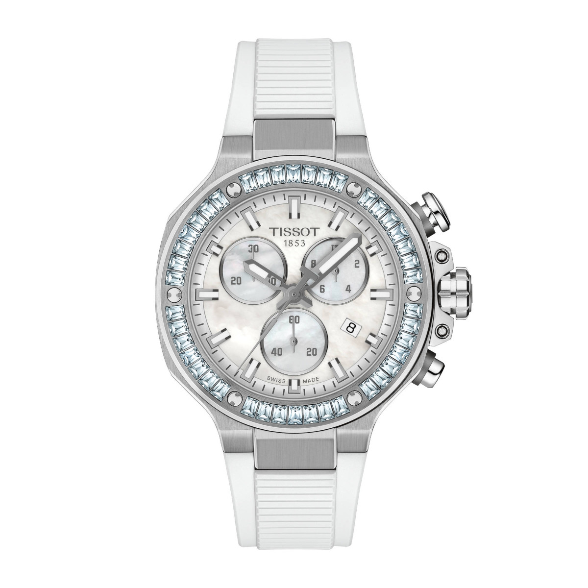 Tissot hat sich von seiner Partnerschaft mit dem Motorradrennsport inspirieren lassen, um eine Uhr zu kreieren, die die Dynamik von Motorrädern und die Emotionen des Sports reflektiert. Die T-Race Kollektion lässt den Träger in eine Welt voller Mechanik und mit einem ganz besonderen Spirit eintauchen. Die Lünette ähnelt einer Bremsscheibe, die Drücker sind von Lenkergriffen inspiriert, und auf der Gehäuseseite sind die Kühlrippen eines Motors nachgebildet. Die Tissot T-Race Quartz Chronograph 38mm ist bis zu einem Druck von 10 bar (100 m) wasserdicht und mit einem präzisen Quarz-Chronographenwerk ausgestattet.