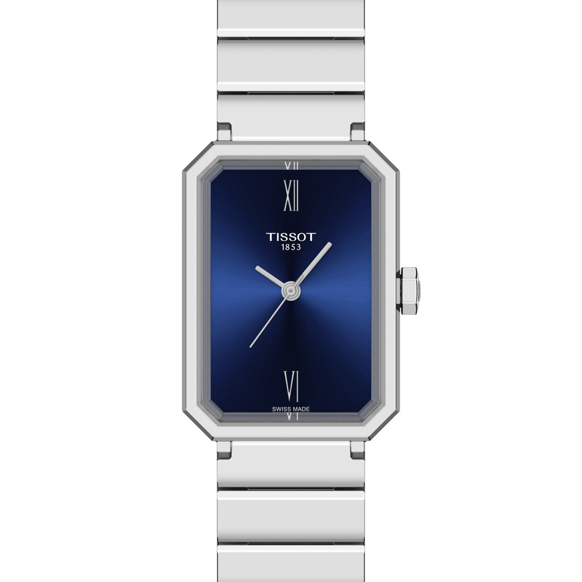 Das Quarzwerk der Tissot SRV sorgt für dauerhafte Präzision, und dank der End-of-Life-Anzeige, die frühzeitig das Ende der Batterielebensdauer signalisiert, gibt es keine ungewollten Überraschungen. SRV ist nicht einfach nur ein Name, sondern steht für „Saphirglas“, „Rechteckig“ sowie die römische Zahl Fünf (V): Das facettierte Saphirglas folgt der eckigen Form des 316L-Edelstahlgehäuses mit den Maßen 30 x 21,8 mm, und das „V“ repräsentiert die Wasserdichtigkeit bis zu einem Druck von 5 bar (50 m).
