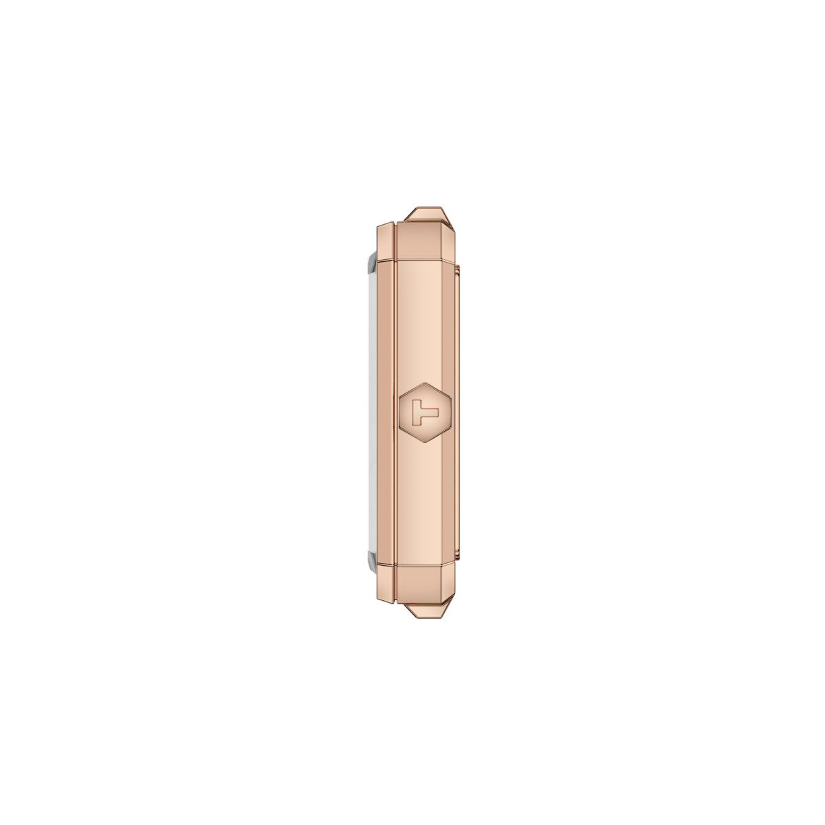 Das Quarzwerk der Tissot SRV sorgt für dauerhafte Präzision, und dank der End-of-Life-Anzeige, die frühzeitig das Ende der Batterielebensdauer signalisiert, gibt es keine ungewollten Überraschungen. SRV ist nicht einfach nur ein Name, sondern steht für „Saphirglas“, „Rechteckig“ sowie die römische Zahl Fünf (V): Das facettierte Saphirglas folgt der eckigen Form des 316L-Edelstahlgehäuses mit den Maßen 30 x 21,8 mm, und das „V“ repräsentiert die Wasserdichtigkeit bis zu einem Druck von 5 bar (50 m).