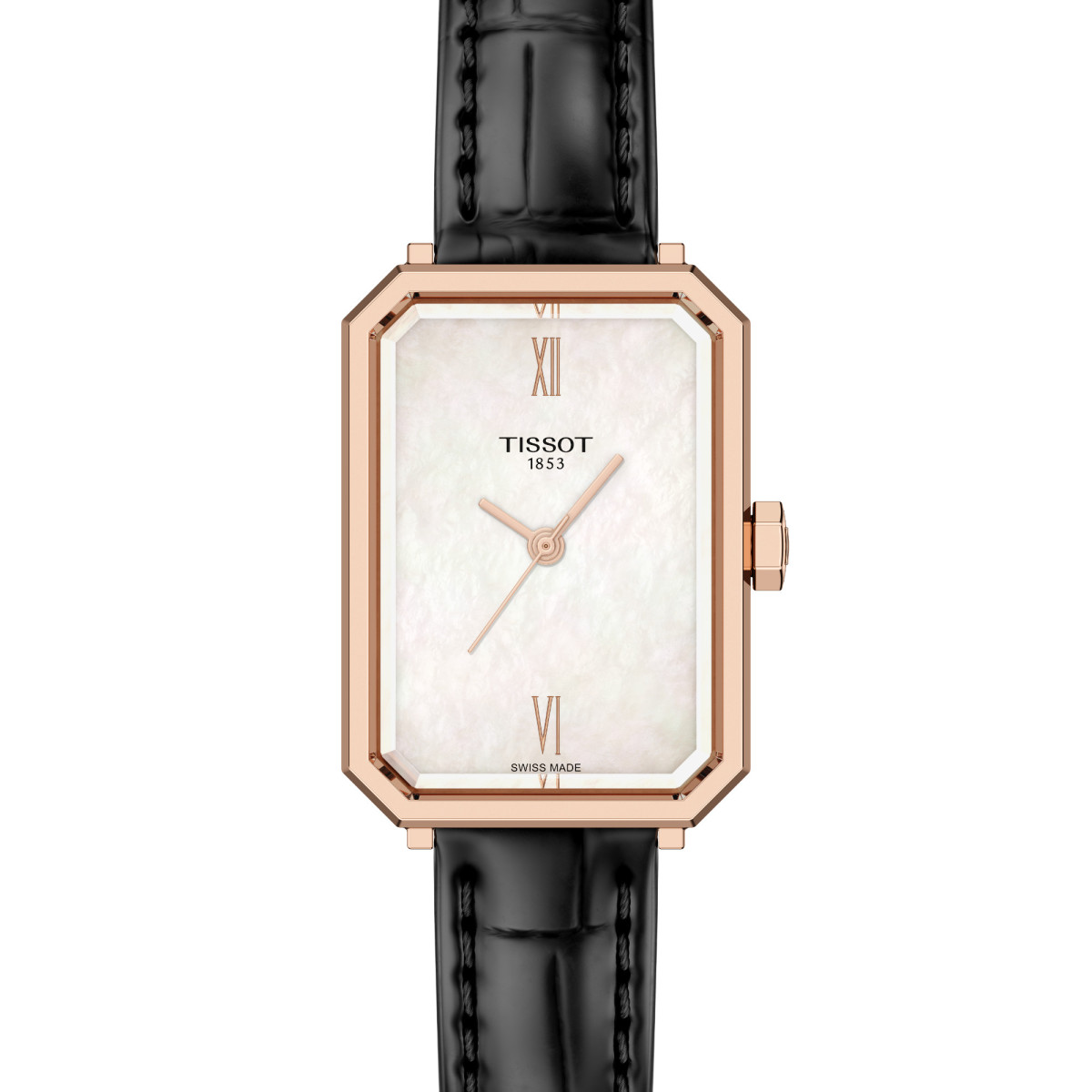 Diese Ausführung der Tissot SRV besitzt ein 316L-Edelstahlgehäuse mit roségoldfarbener PVD-Beschichtung, ein weißes Perlmuttzifferblatt mit römischen Ziffern bei 12 und 6 Uhr sowie ein schwarzes Lederarmband.